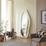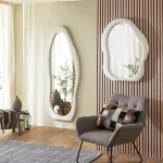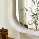 Serene modern foyer or bedroom accent wall with a playful yet sophisticated touch. The statement piece is an oversized squiggle-shaped mirror (approximately 1.5–2 meters tall) with a bold matte-black undulating frame that mimics hand-drawn waves or clouds, adding whimsical organic movement to the clean space. Below it sits a sleek, ultra-thin waterfall console table crafted from natural travertine or light beige marble with visible subtle veining and softly rounded edges, giving it a luxurious monolithic look. The console is styled minimally with a single low, wide dark-smoked glass bowl/vase as a centerpiece. The wall is crisp white, the floor is light herringbone oak parquet, and soft natural light filters in from a partially visible window with sheer curtains. The reflection in the mirror reveals hints of a bedroom beyond—neutral bedding and a wavy headboard that echoes the mirror’s shape. The overall palette is warm neutrals with strong black contrast, blending quiet luxury with trendy squiggly-mirror aesthetics.
