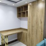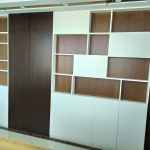 This modern retail or display space features a built-in cabinet system with a white and blue color scheme, designed for both functionality and visual appeal. The unit includes multiple glass shelves framed by blue panels, ideal for showcasing products, while white drawers at the base offer concealed storage. Integrated LED lighting highlights the clean lines and enhances the display’s visibility. The room is finished with glossy white marble flooring and a white desk, contributing to the sleek aesthetic. A decorative wall panel with a blue and brown abstract design and a mirrored section adds depth and contrast. A person is seen adjusting the cabinet, indicating the space is under setup or renovation. This interior exemplifies contemporary retail design that merges elegance with practicality.