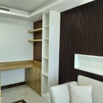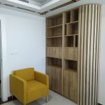 This modern interior showcases a full-wall built-in wardrobe crafted from vertical wooden panels with a natural grain finish, offering both visual warmth and functional elegance. The ceiling features a recessed design with integrated lighting that highlights the texture and tone of the wood, creating a subtle contrast against the light gray flooring. The clean lines and neutral palette contribute to a minimalist aesthetic, making the space feel open and refined. Ideal for residential or commercial interiors, this setup exemplifies contemporary design that prioritizes simplicity, texture, and spatial harmony.