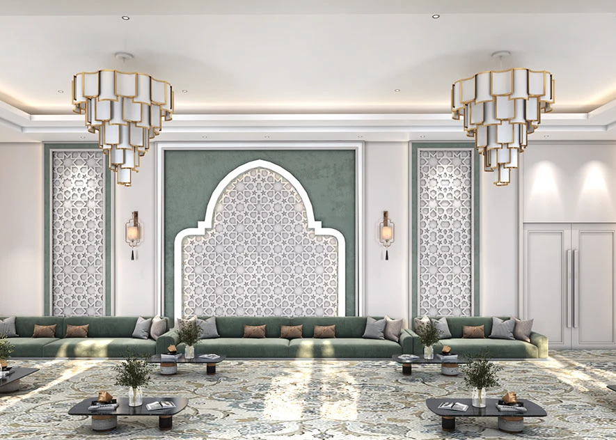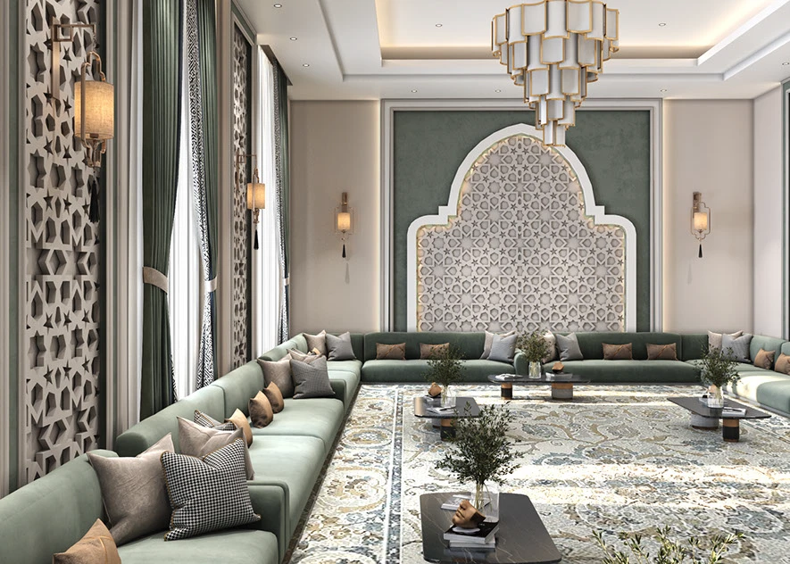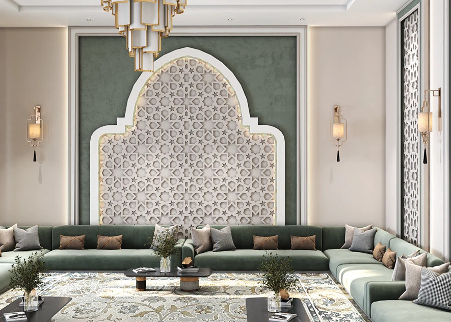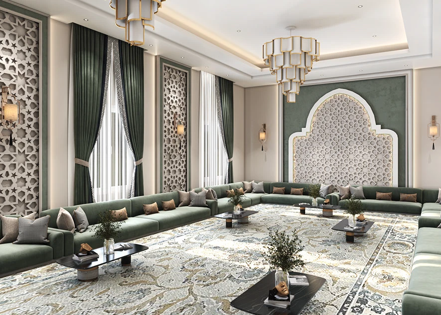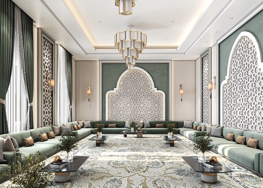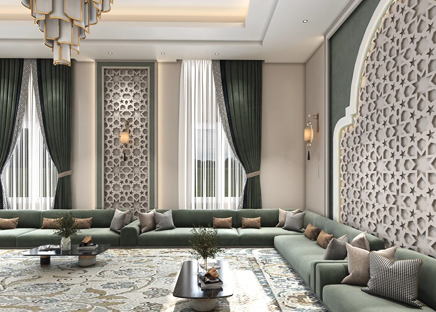 The Majlis Harmony sofa comes in a spacious shaped design, upholstered in rich emerald green to anchor gatherings with elegance. Plush seating and earthy‑tone cushions—beige, taupe, and charcoal—add both depth and cozy support. Perfect for large living rooms or majlis settings
