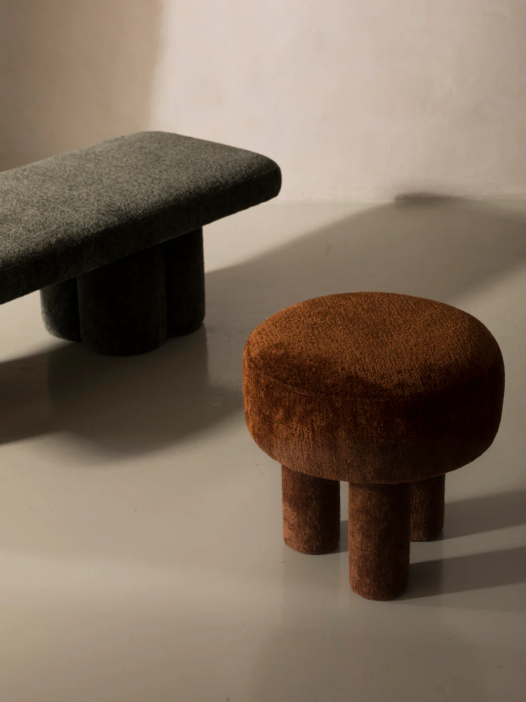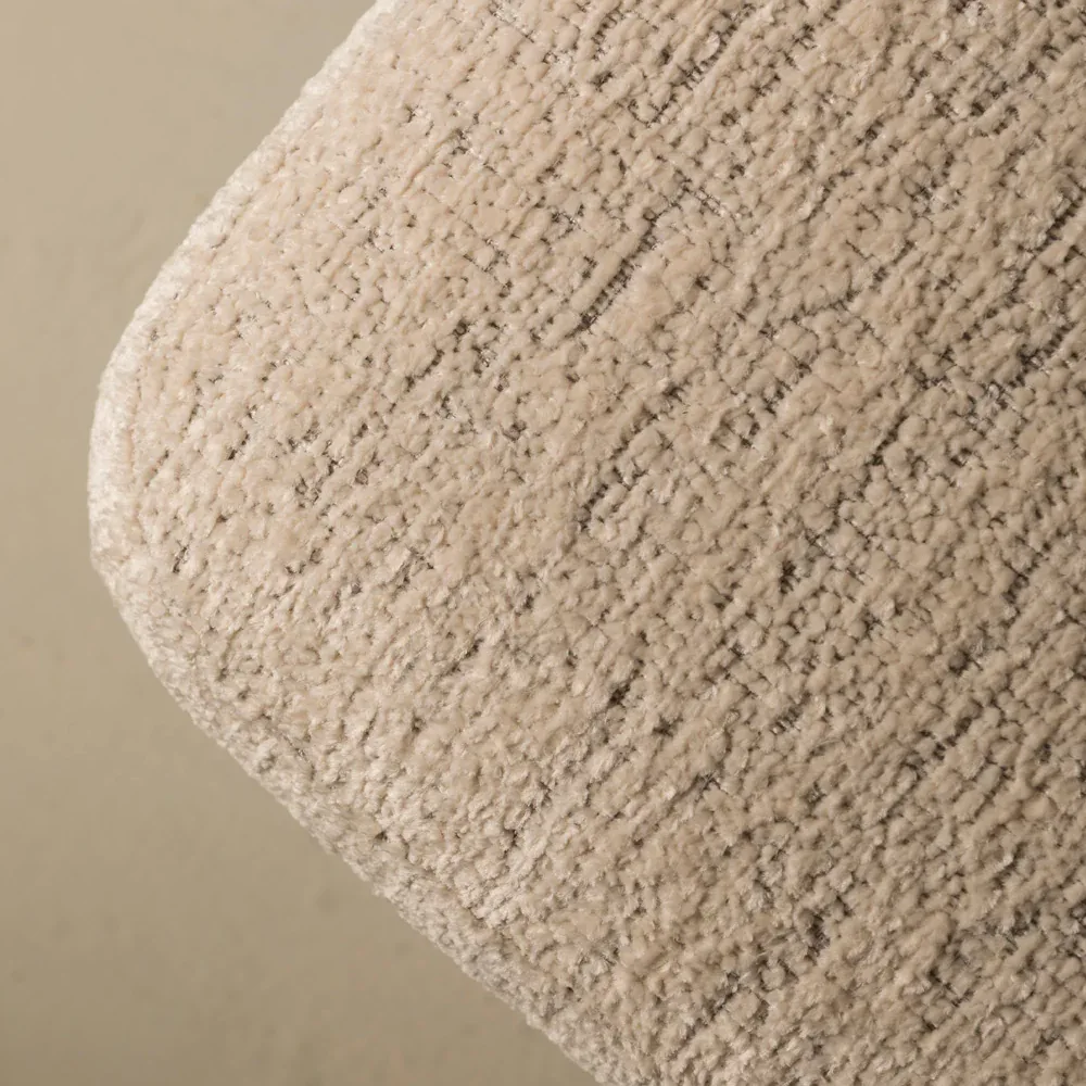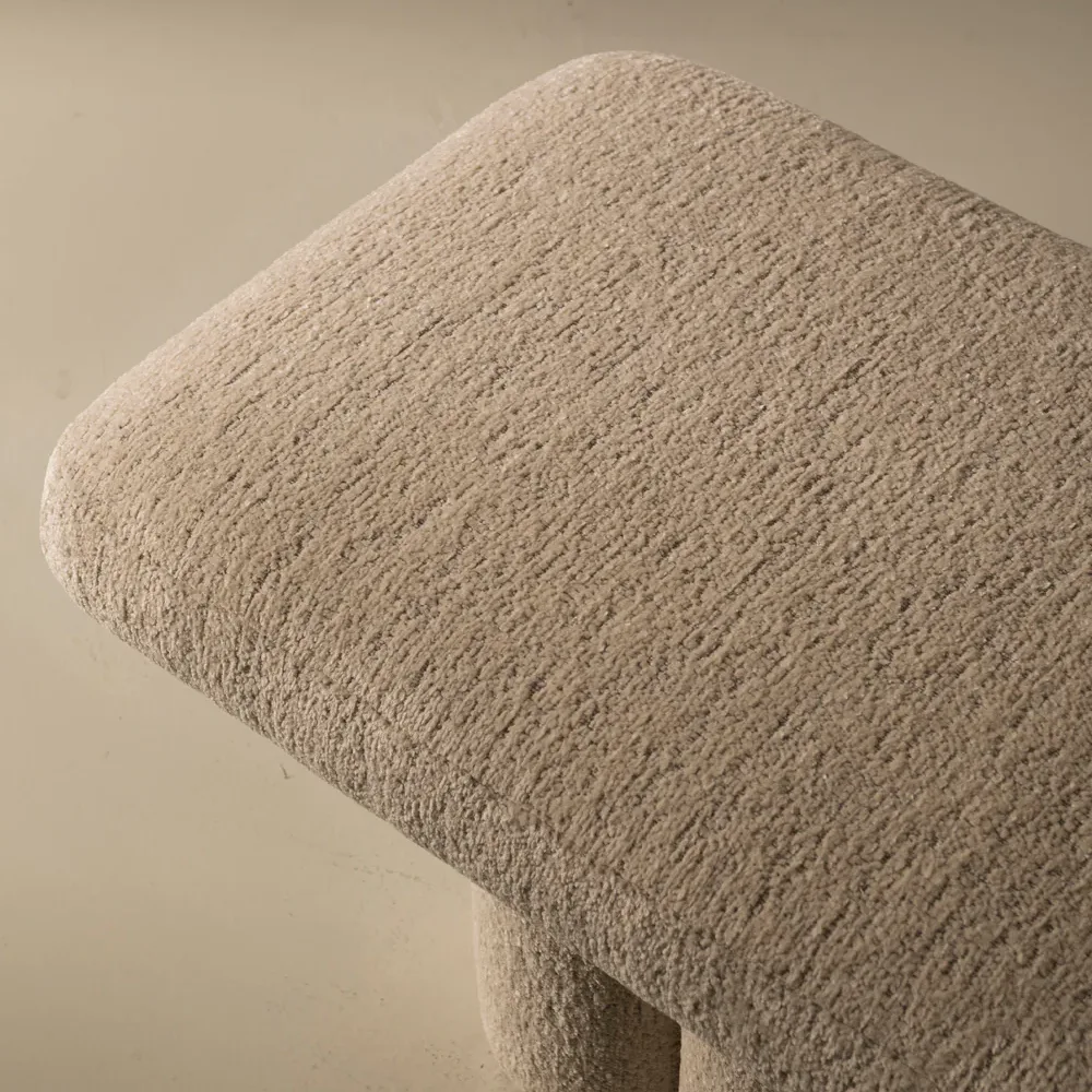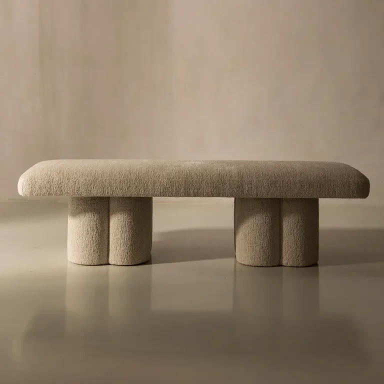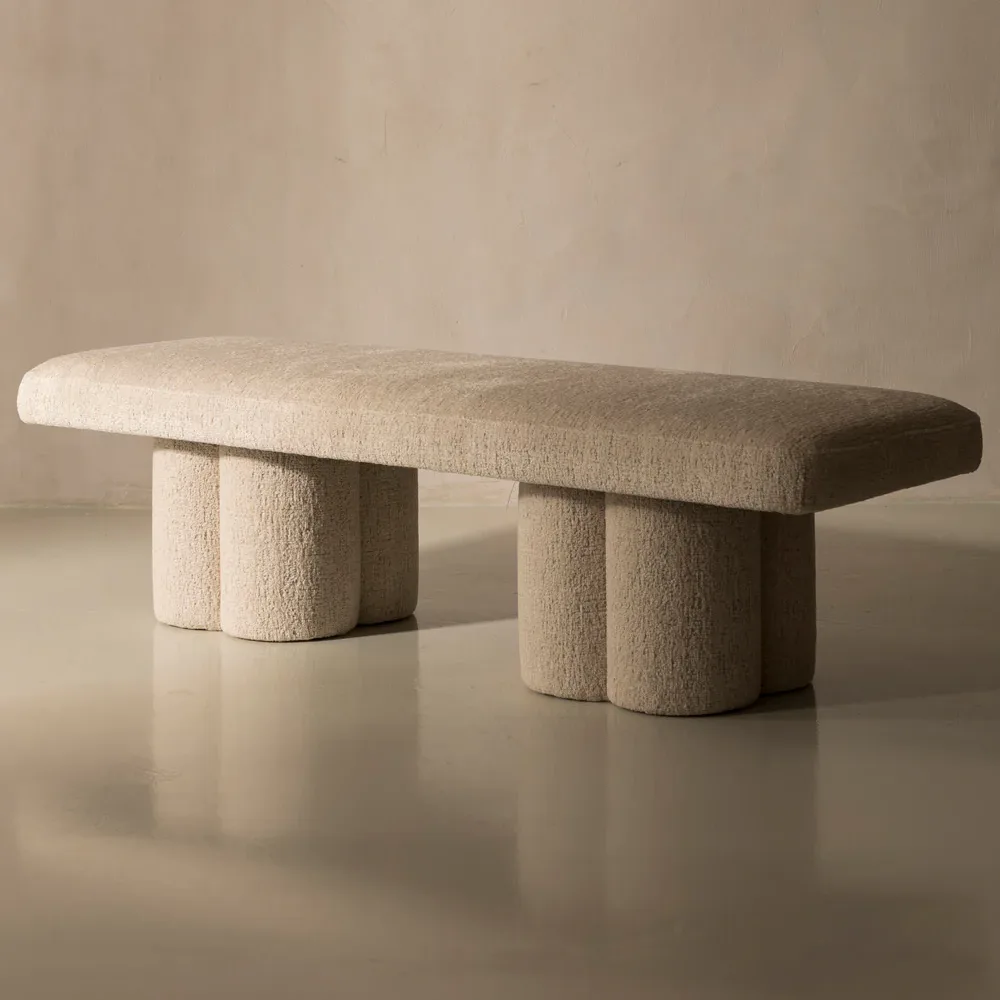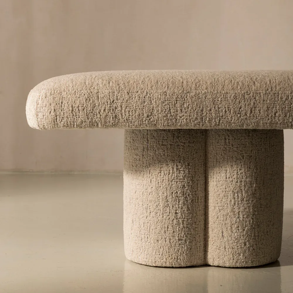 Soft curves meet sculptural charm in this minimalist bench, upholstered in cozy almond-toned boucle. Its petal-shaped cylindrical legs add a playful, artful touch—perfect for modern interiors.