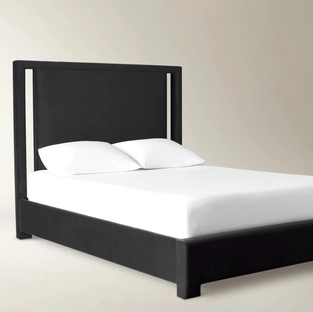 The Aurum Frame Bed brings refined minimalism into the modern bedroom with its sleek black upholstery and structured silhouette. Its padded headboard, framed by vertical side panels, creates a bold architectural presence while offering exceptional comfort. Designed for contemporary interiors, it elevates any space with its clean lines and timeless aesthetic.