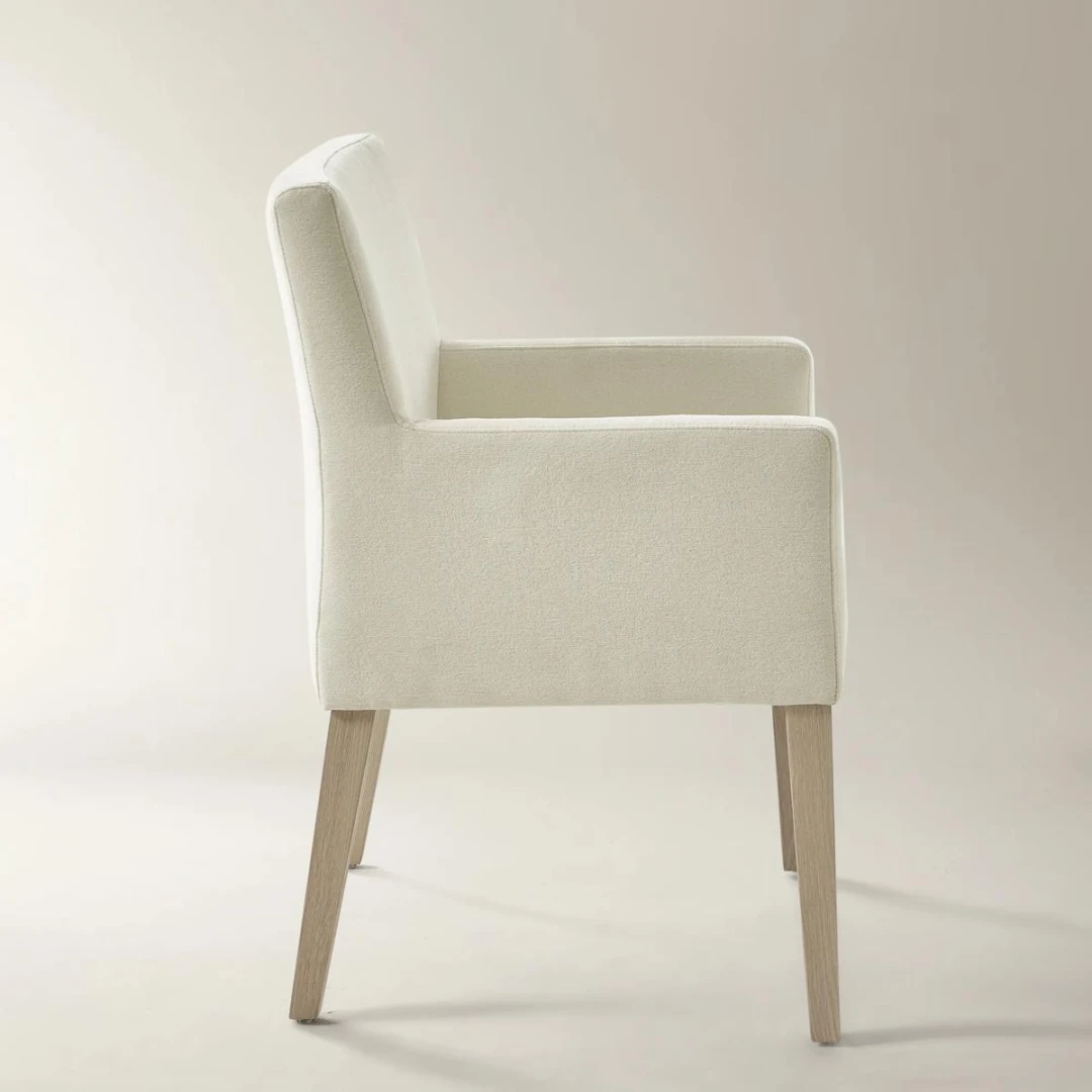 The Beigeform Chair blends simplicity and warmth in a design that’s both timeless and versatile. Upholstered in soft beige fabric, it offers a neutral palette that complements a wide range of interior styles. Its clean lines and gently curved armrests create a welcoming silhouette, while the light wood legs add natural texture and stability.