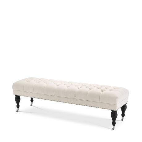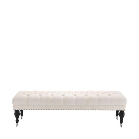 Grace your home interior with the timeless beauty of the Benedict Bench. Featuring a deep buttoned upholstery that breathes the classic chic of Chesterfields, nickel studs, beautiful turned legs and nickel castor wheels, this ecru velvet ottoman elevates your classic décor.