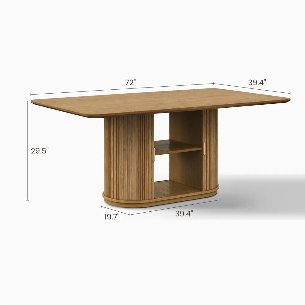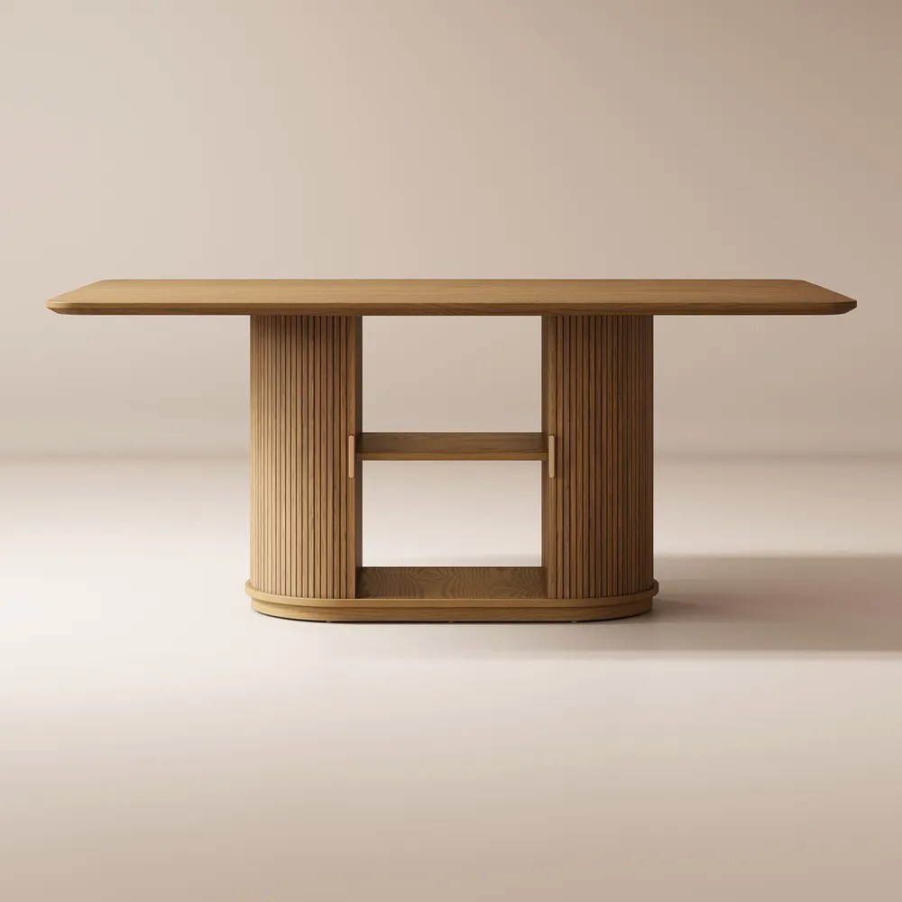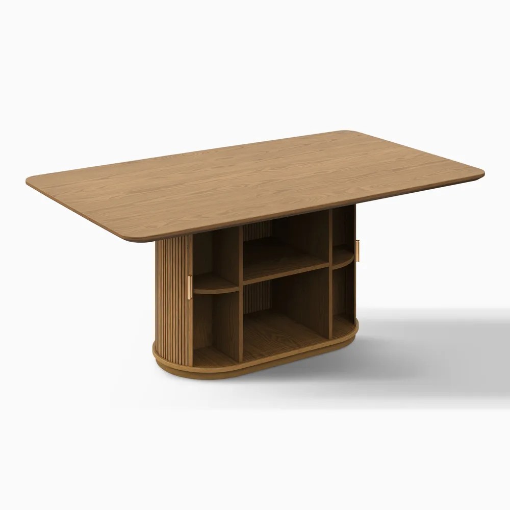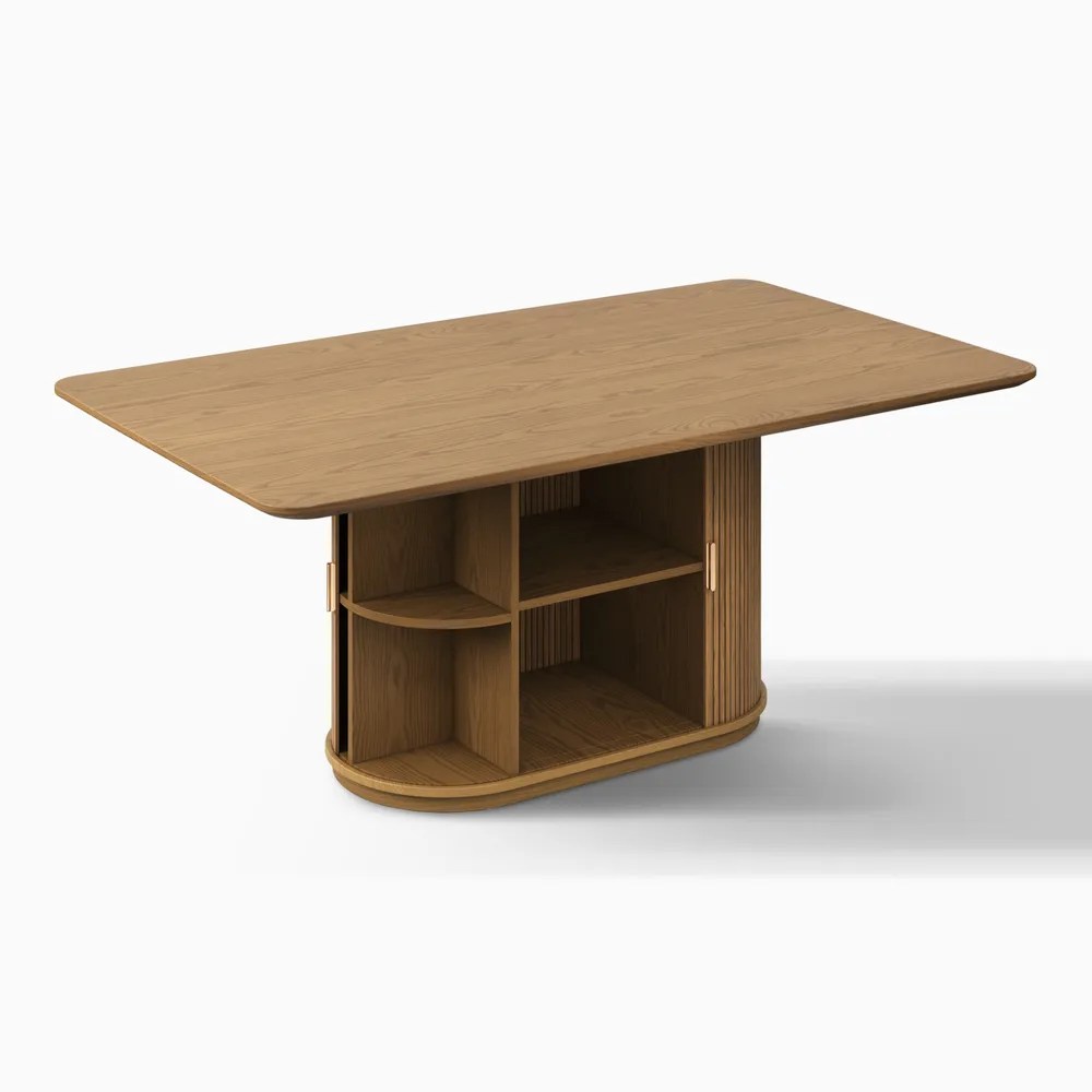 This dining table is a celebration of timeless craftsmanship and sculptural elegance. Finished in natural ash wood, it features a striking base and seamlessly integrated storage enhanced by sleek tambour doors. Designed to elevate any dining space, it blends artistry with functionality to create a sanctuary of style.