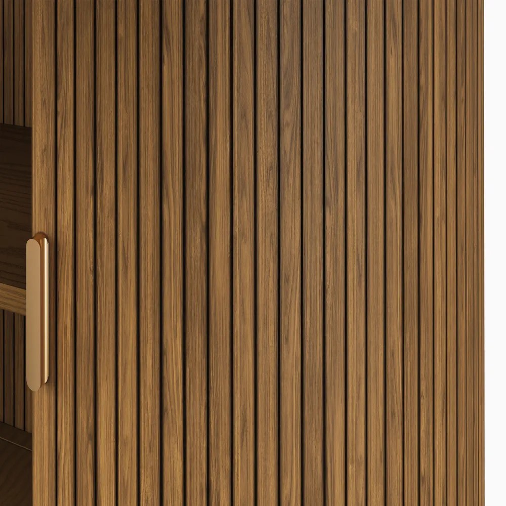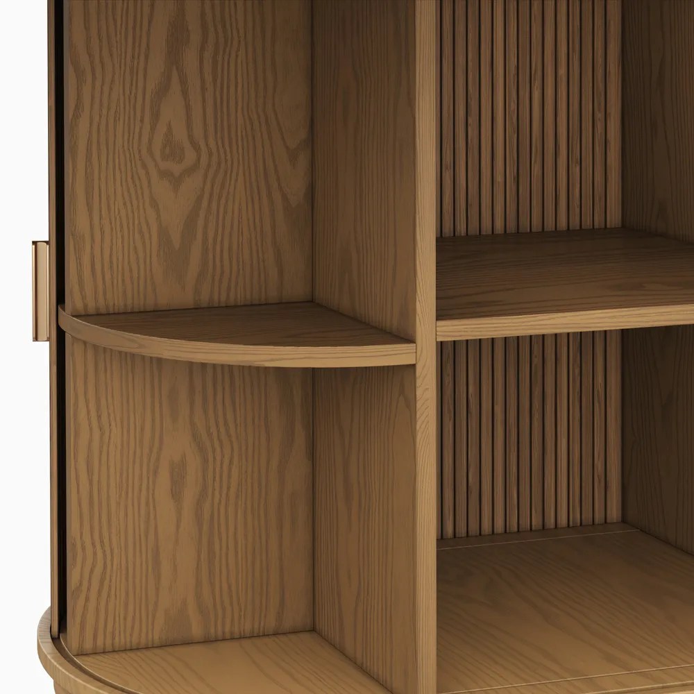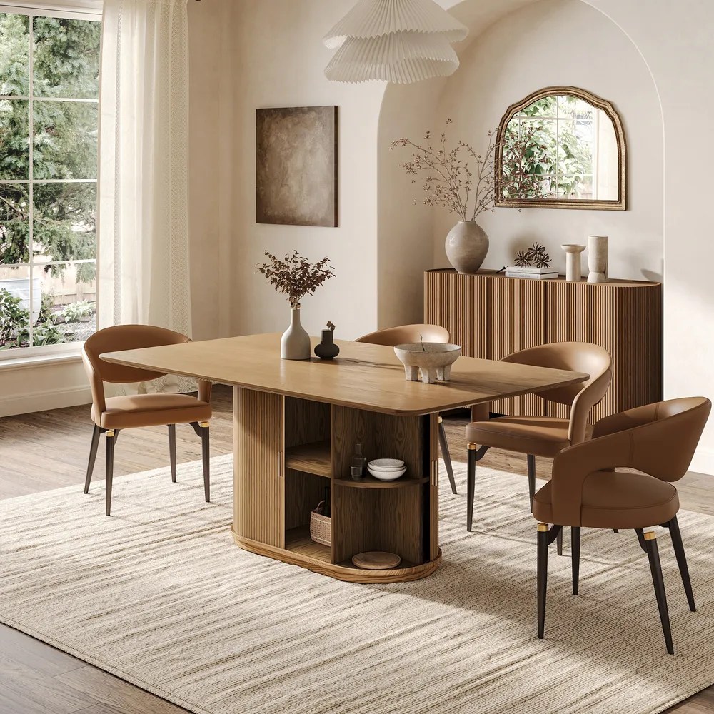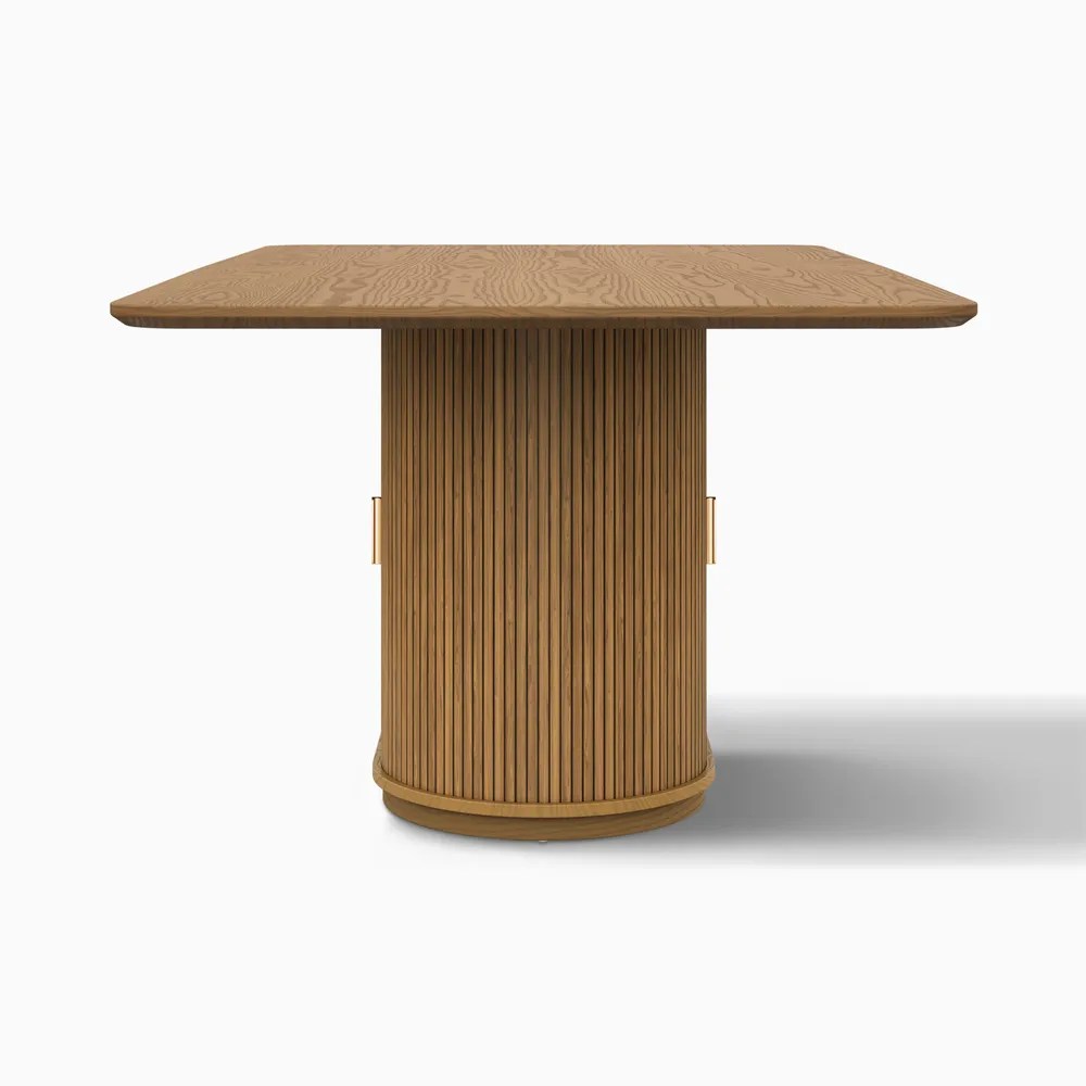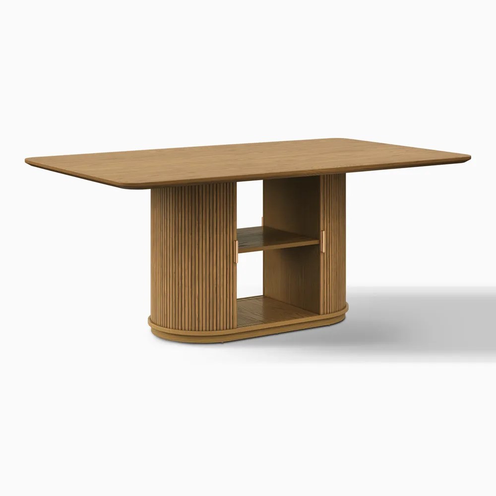 This dining table is a celebration of timeless craftsmanship and sculptural elegance. Finished in natural ash wood, it features a striking base and seamlessly integrated storage enhanced by sleek tambour doors. Designed to elevate any dining space, it blends artistry with functionality to create a sanctuary of style.
