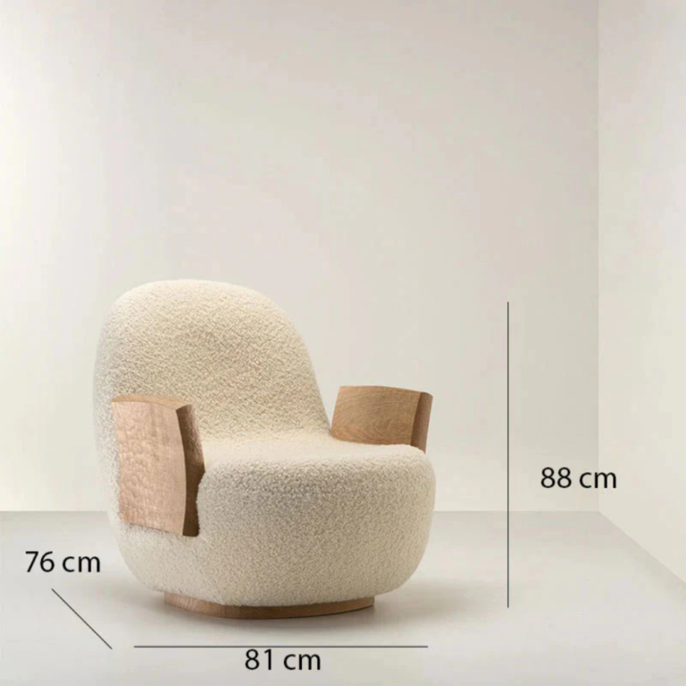 The Ode Chair is a serene blend of Nordic functionality and cloud-like comfort. Built on a solid wood base and wrapped in soft lamb wool bouclé, it offers a tactile sanctuary that invites you to slow down and unwind. Its sculptural form and minimalist aesthetic make it a refined addition to any modern interior.The curved silhouette and plush bouclé upholstery provide a warm, cocooning feel, while the natural wood base adds grounding contrast and durability.
