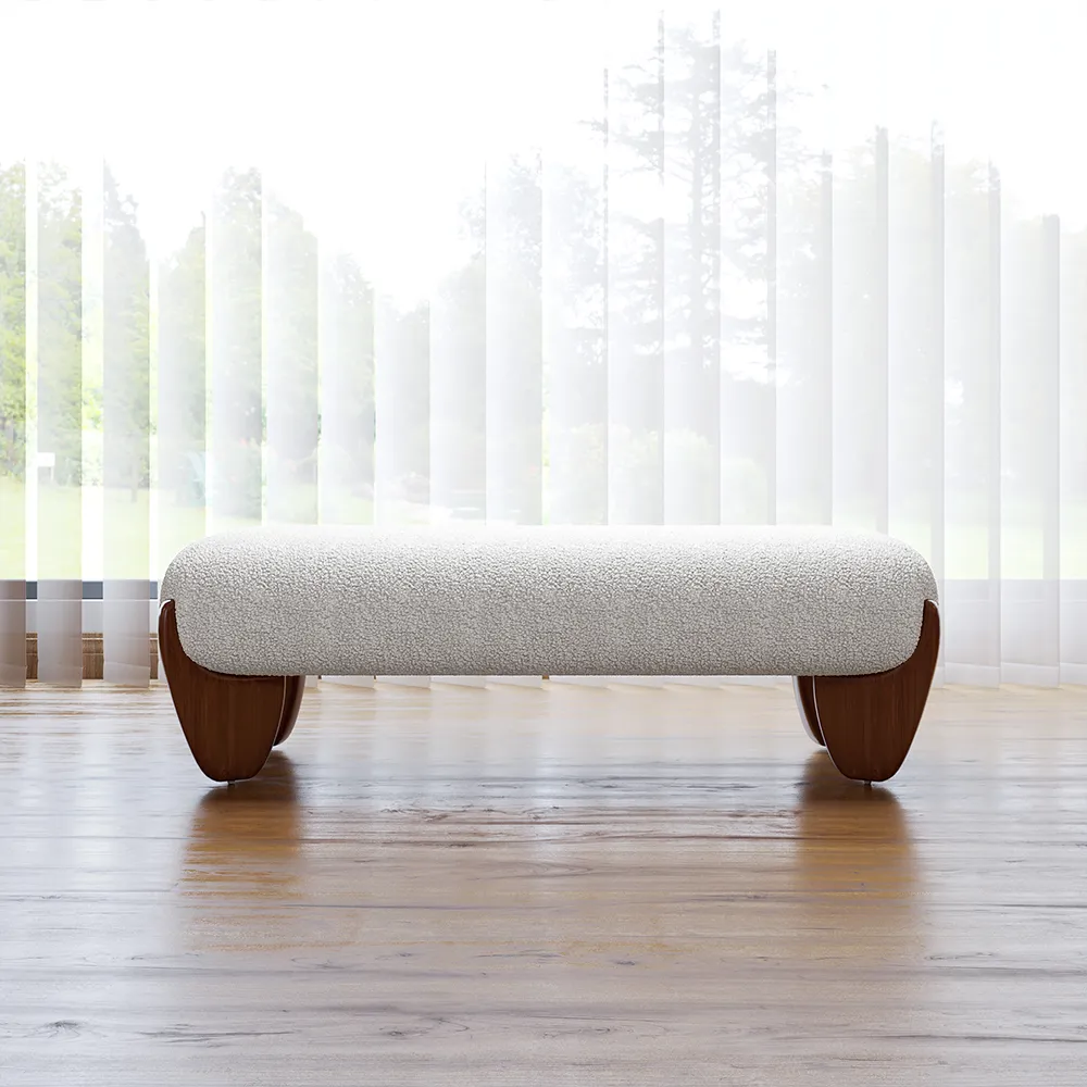 This beige bouclé bench is a stylish and versatile addition to any room. Upholstered in soft bouclé fabric, it offers a cozy, textured feel while maintaining a modern look. The sturdy wooden legs provide durability and a natural touch, making it suitable for bedrooms, entryways, or living spaces. Whether used as extra seating, a decorative accent, or placed at the foot of the bed, this bench combines comfort and elegance to complement a variety of interiors.
