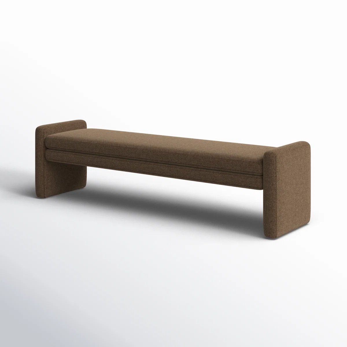 Cream, boucle-like upholstery covers a long, sophisticated dining bench.