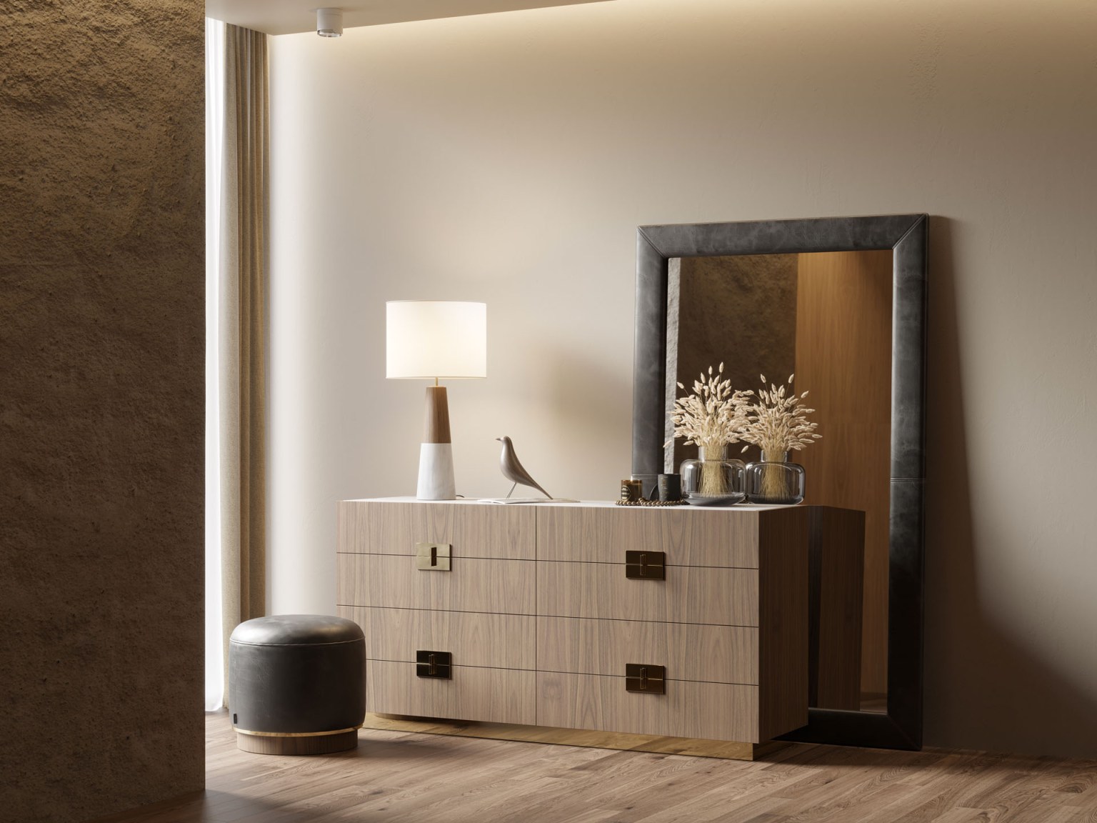 The grandeur chest of drawers is the focal point of contemporary bedrooms and luxury dining rooms. Symbol of sobriety, this furniture piece stands out for its metal details and wood color. Lady features eight drawers with metal handles that gently lay in a metal base.