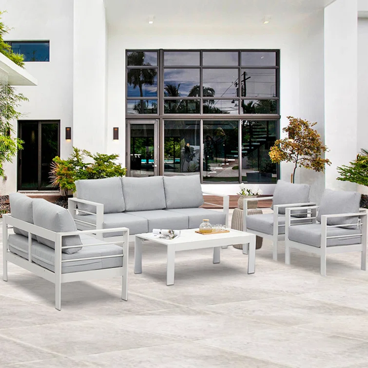Crafted from powder-coated mild steel, this set includes two armchairs, a loveseat, a spacious 3-seater sofa, and a coffee table. The upgraded fabric cushions are soft, breathable, and fade-resistant, while high-density sponge filling offers medium-firm support to reduce fatigue during extended lounging. With 14 included cushions and machine-washable covers, maintenance is simple and stress-free.Pair it with sculptural outdoor lighting or textured planters from our Outdoor Collection to complete your setup. Whether you’re entertaining guests or enjoying a quiet evening under the stars, this set offers comfort, style, and versatility for any outdoor space.