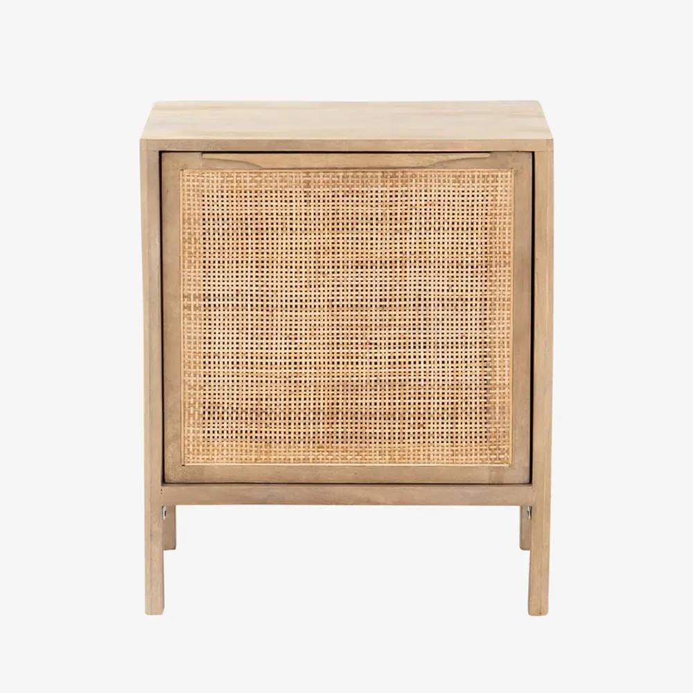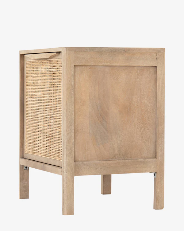 Crafted from solid wood, the Kenan Natural Nightstand beautifully mixes materials in a simple design. Subtle details elevate the presence of this nightstand, with the smooth frame contrasted by the inset cane on the door.