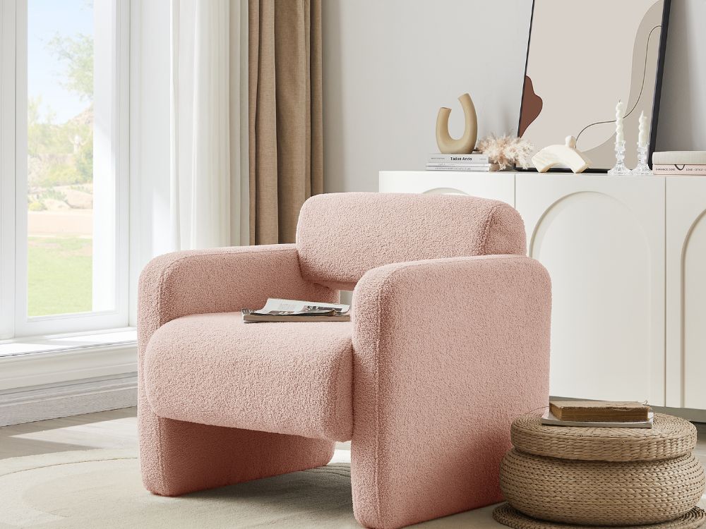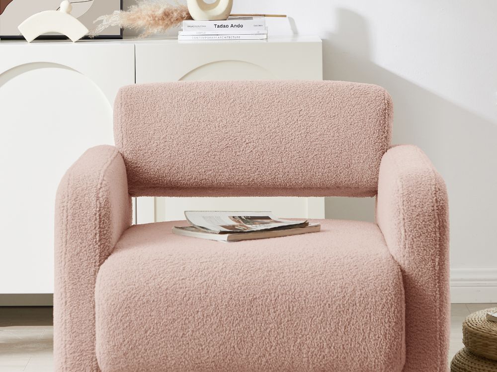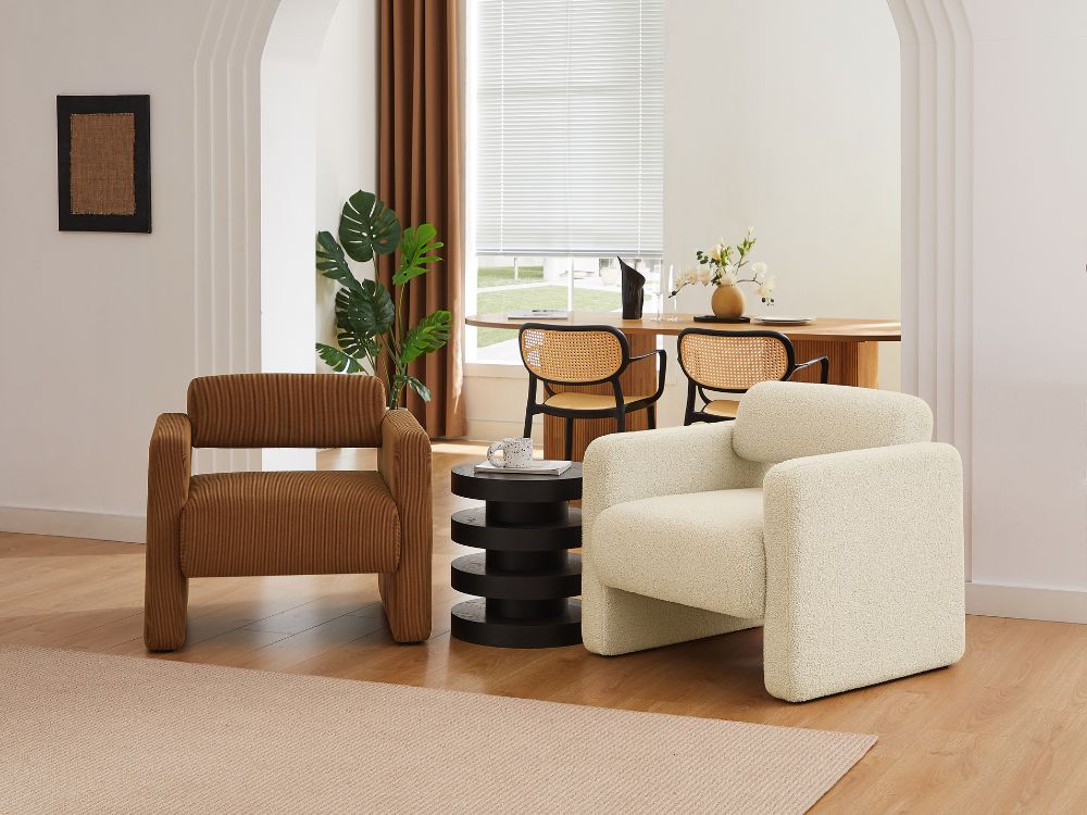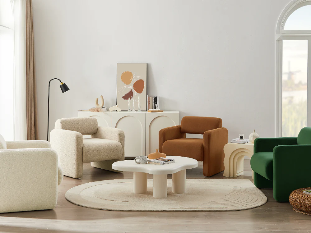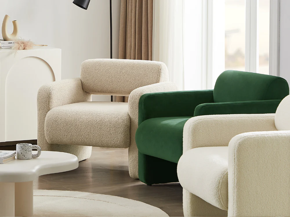 Tactile Fabric"Featuring an extra soft boucle fabric, the Lorraine arm chair is so cozy that you may find yourself petting it each time you pass by. Trendy Colours" The Lorraine arm chair is available in four eye-catching colours to match your mood and your home decor. Whether you prefer versatile neutrals like white and cream or more adventurous hues like brown or green, you will find exactly what you are looking for.