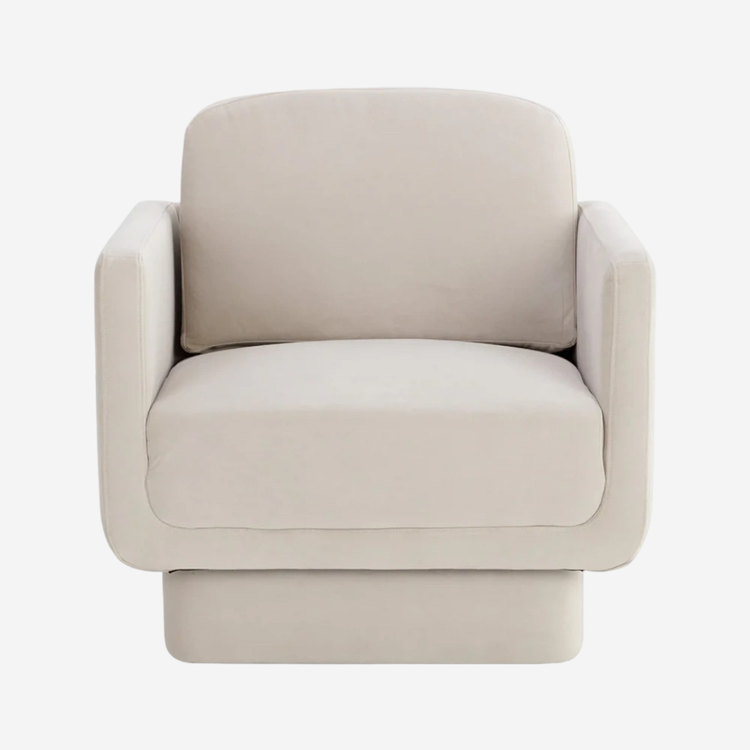 The Lumo Lounge Chair combines sculptural U‑shaped arms, a floating squared base, soft Meg Taupe upholstery, and durable high‑density support to deliver compact, comfortable, and contract‑viable seating with a modern, versatile aesthetic.
