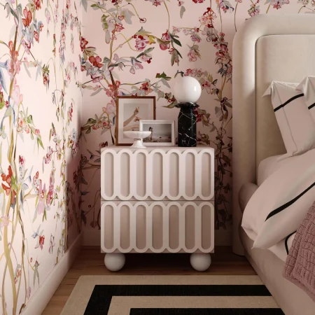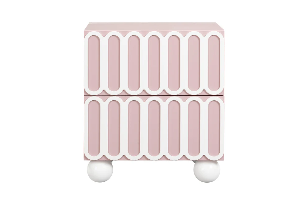 Say goodbye to a boring bedtime routine with the Tori Motif Nightstand, available in dreamy mauve or blue and sophisticated taupe, each featuring a statement-making facade that truly pops. Its solid wood, spherical legs infuse a sculptural Hollywood buzz, while the medium sheen on the surfaces delivers just the right amount of drama without fussy maintenance. Plus, the nightstand’s drawers glide smoothly on soft-close rails, ensuring you keep the morning peace, not waking your partner as you start your day.