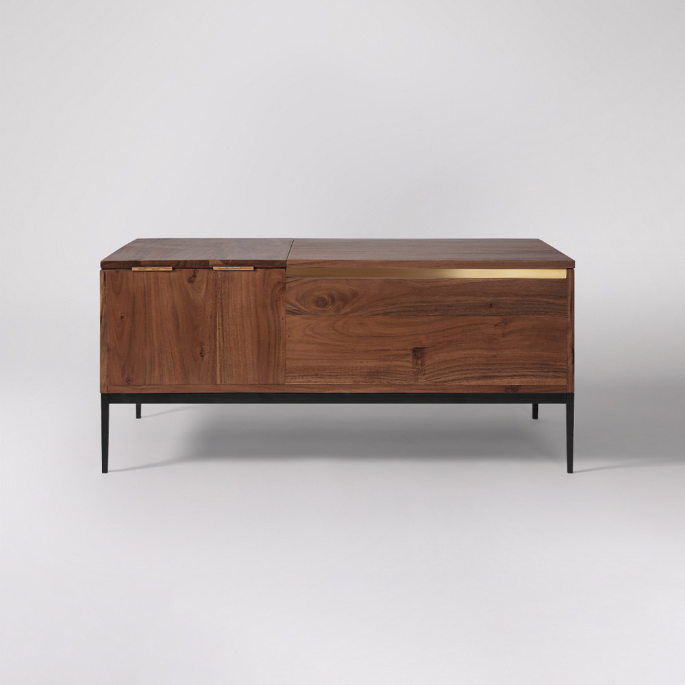 - Materials: acacia body and doors, engineered contrast panel, steel legs, door rails and underframe