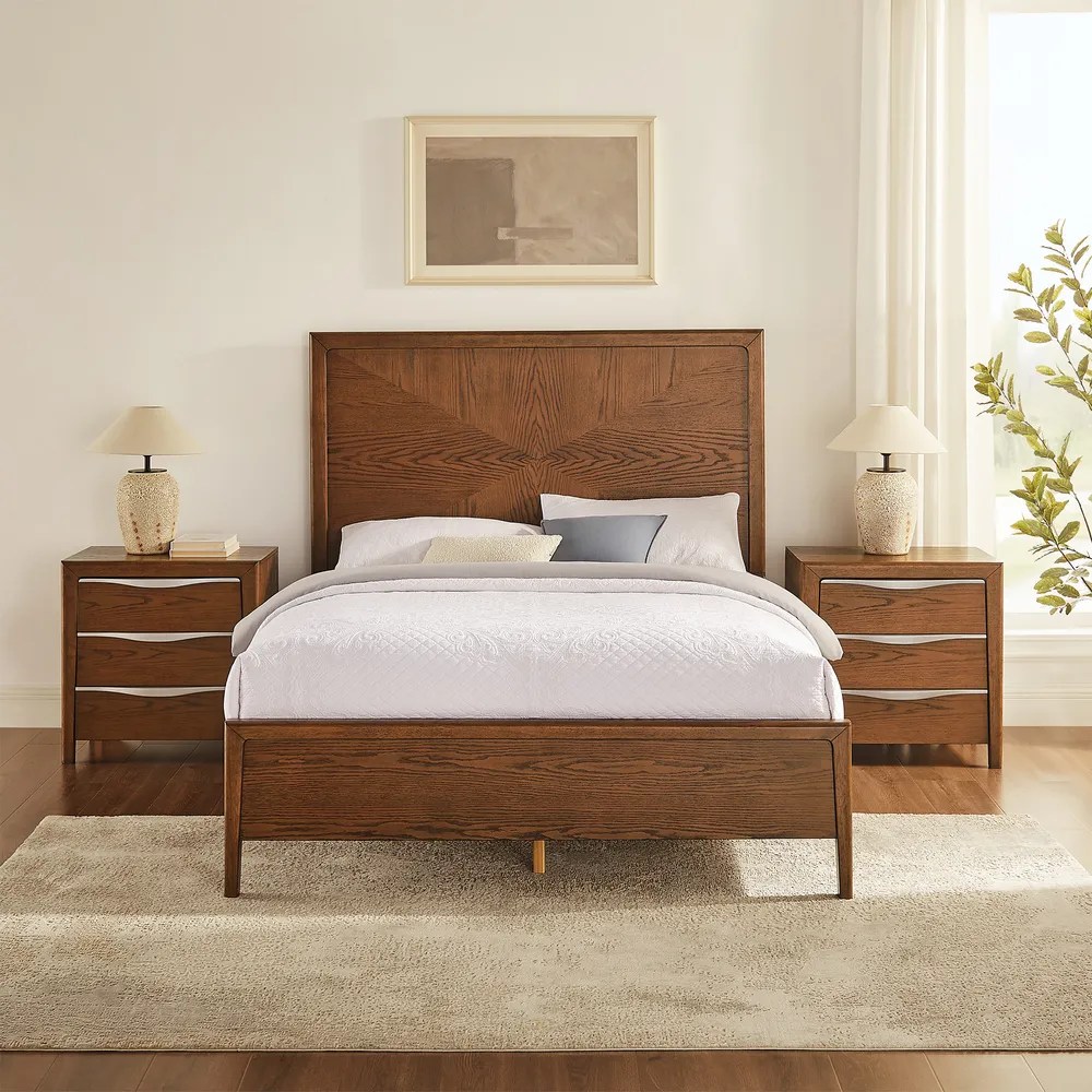 A masterful fusion of modern sophistication and vintage maximalist charm, this queen bed is designed to make a bold statement while offering refined detail. Crafted from solid wood and engineered wood with rich American oak veneers, it promises lasting durability and timeless elegance.