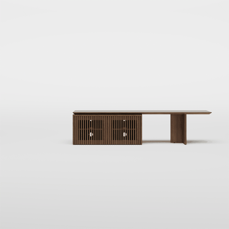 This smart TV unit features remote-controlled cabinet access, allowing you to operate devices without opening the doors. The grid-patterned façade adds architectural depth, while the hidden compartments provide generous storage for DVDs, gaming consoles, books, and more. It’s a perfect blend of form and function, designed to keep your space organized and visually refined.