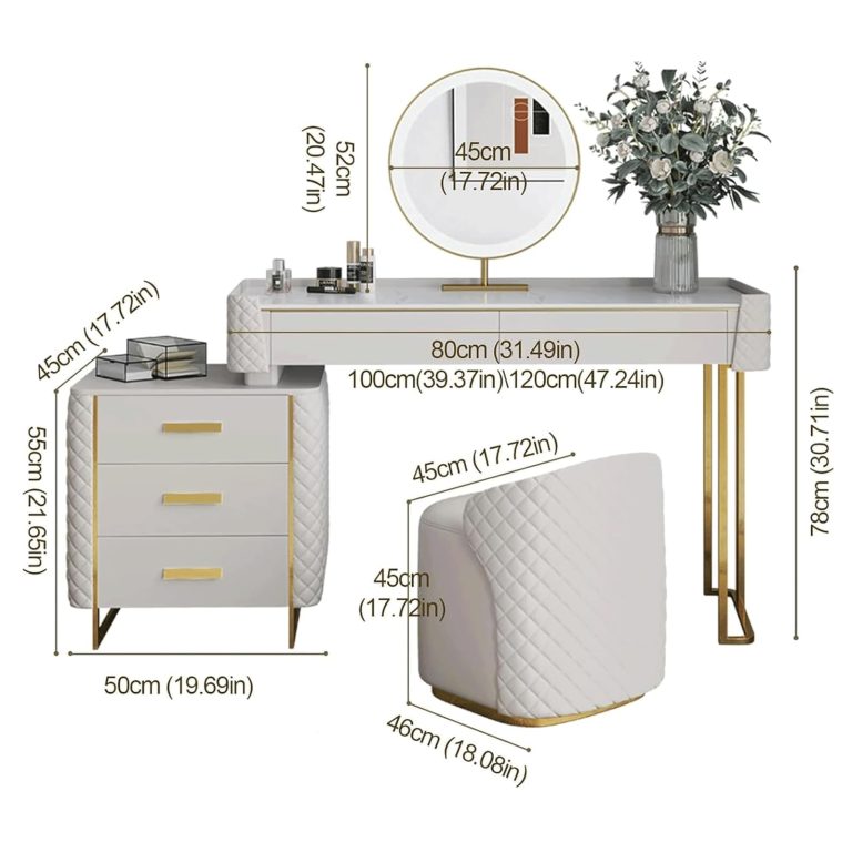 Measuring 120 cm wide × 77 cm deep × 45 cm high (47.24″ × 30.31″ × 17.71″) and weighing 85 kg (187 lbs), this sideboard includes five spacious drawers and a matching stool—making it ideal for use as a vanity, console, or multifunctional storage unit in bedrooms, dressing rooms, or luxury lounges.