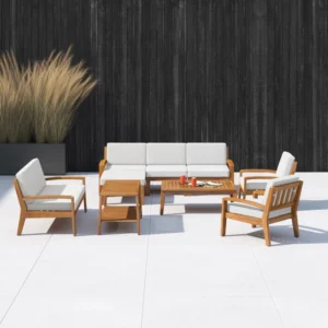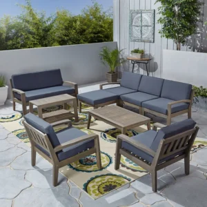 Charm your guests at your next outdoor get-together with our seven-piece sectional sofa set. With plenty of space for every person, this sectional is perfect for hosting outdoor parties in ultimate comfort. Including one left-side piece, one right-side piece, one armless piece, one loveseat, two club chairs, one ottoman, and two coffee tables, this modular design is made to endure outdoor elements with its sturdy Solid wood frames and water-resistant cushions.