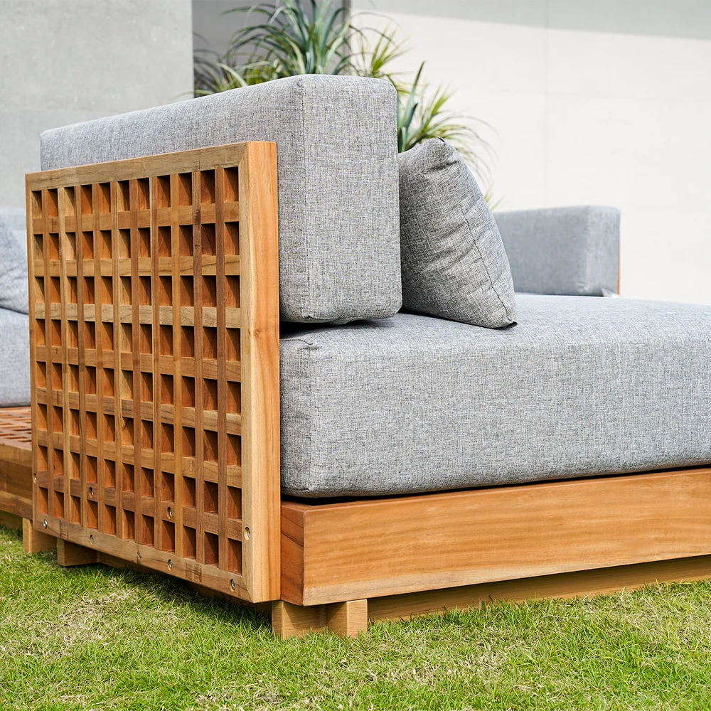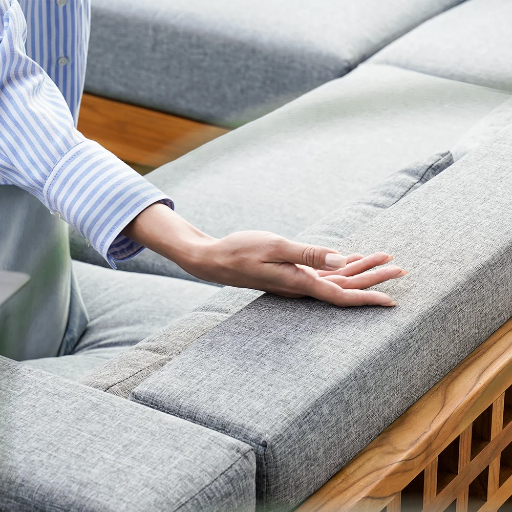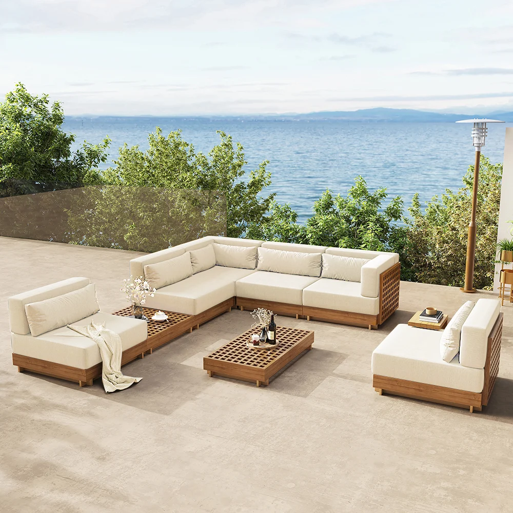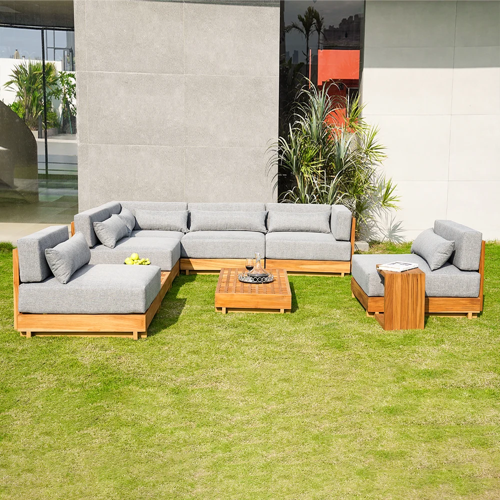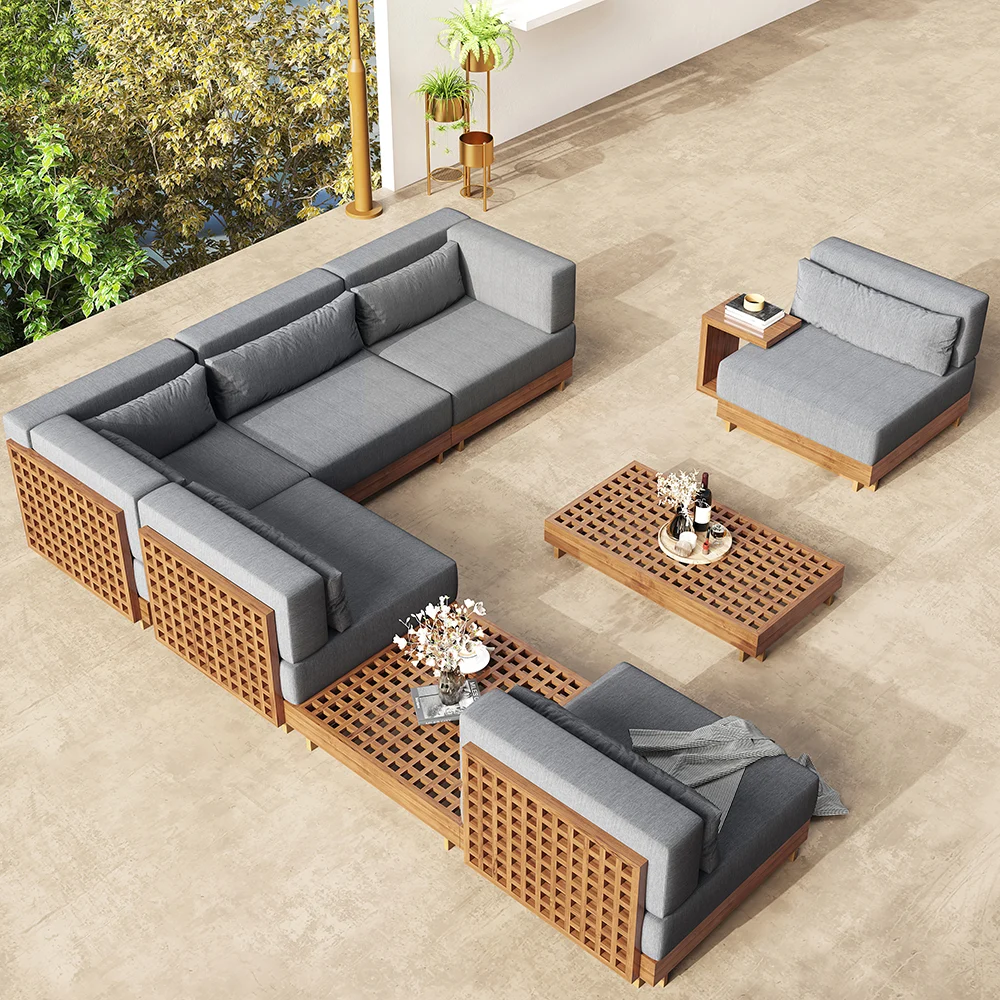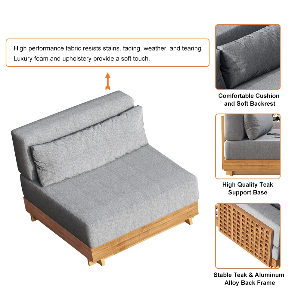 Perfect for large backyards, patios, and other outdoor spaces, this outdoor furniture set creates an oasis for your family in summer. The teak wood & Beech wood makes it timeless yet elegant. Six sofa chairs in modular design can be arranged and rearranged for an unlimited number of configurations, fitting any outdoor setting, activity, or occasion easily. Full solid teak wood/ Beech wood construction ensures the wood ages beautifully with effortless maintenance. Cushions are upholstered with high-performance fabric that resists stains, fading, discoloration, and weather. And thick foam provides entire support to your body. Throw pillows will be shipped in random colors. Arrived fully assembled. (Please note that there will be some differences in product color under different lighting.)
