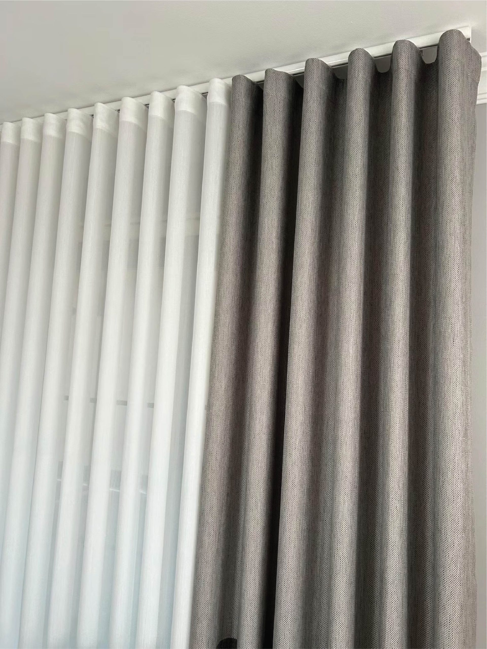 A complete luxury setup featuring blackout fabric, sheer layer, and a smooth motorized track for effortless control. Ideal for modern smart homes.