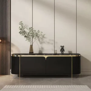 This sleek TV cabinet showcases a curved design in pure white or black, with textured gold stainless steel accents that add modern elegance to any room. The stone-textured top features fine grooves and painted finishes, highlighting artisanal craftsmanship. A velvet-lined interior enhances the storage experience with a touch of luxury. The four-door layout, with widened and curved doors, provides ample space for various items. Crafted from multi-layer solid wood, the cabinet holds up to 110 lbs, while stainless steel legs ensure stability and effortless cleaning. Fully assembled upon delivery, this cabinet blends style, functionality, and convenience seamlessly.