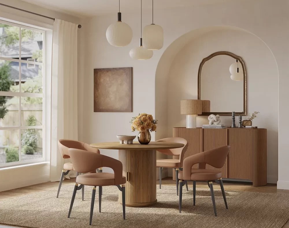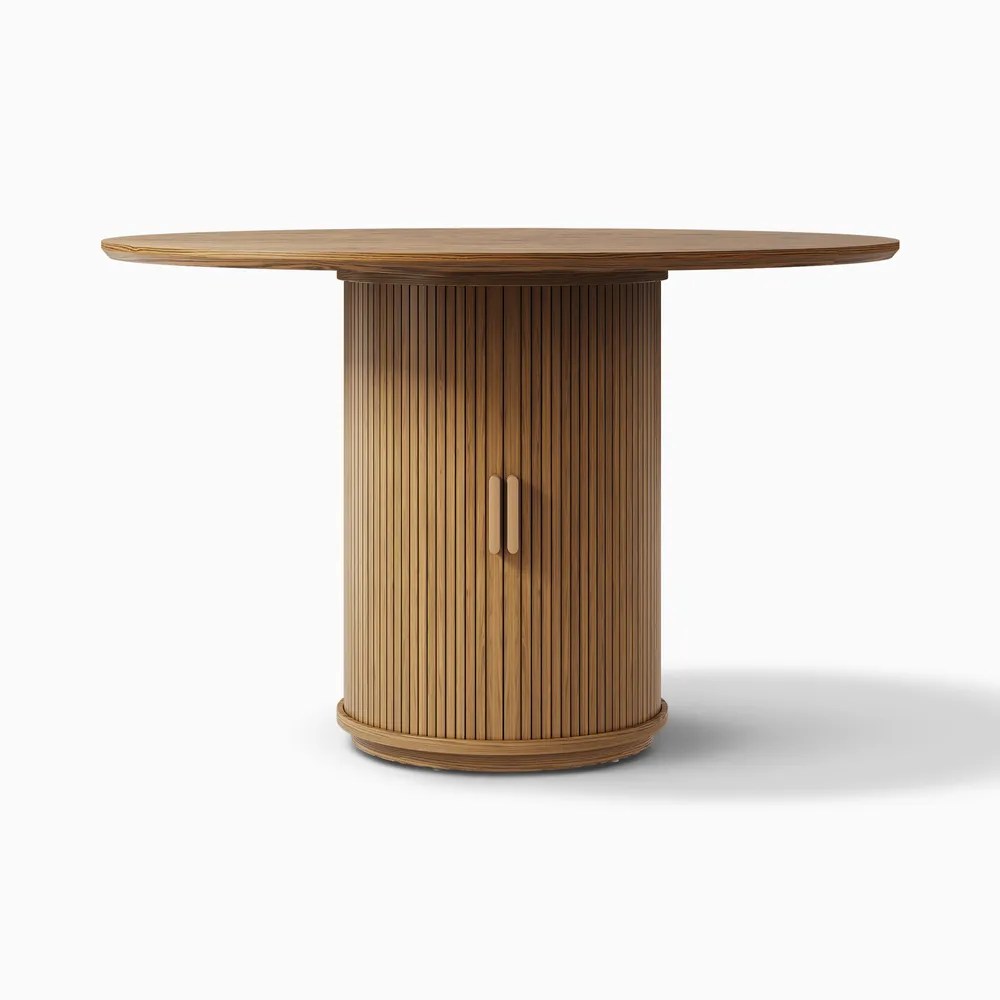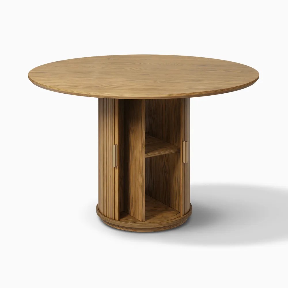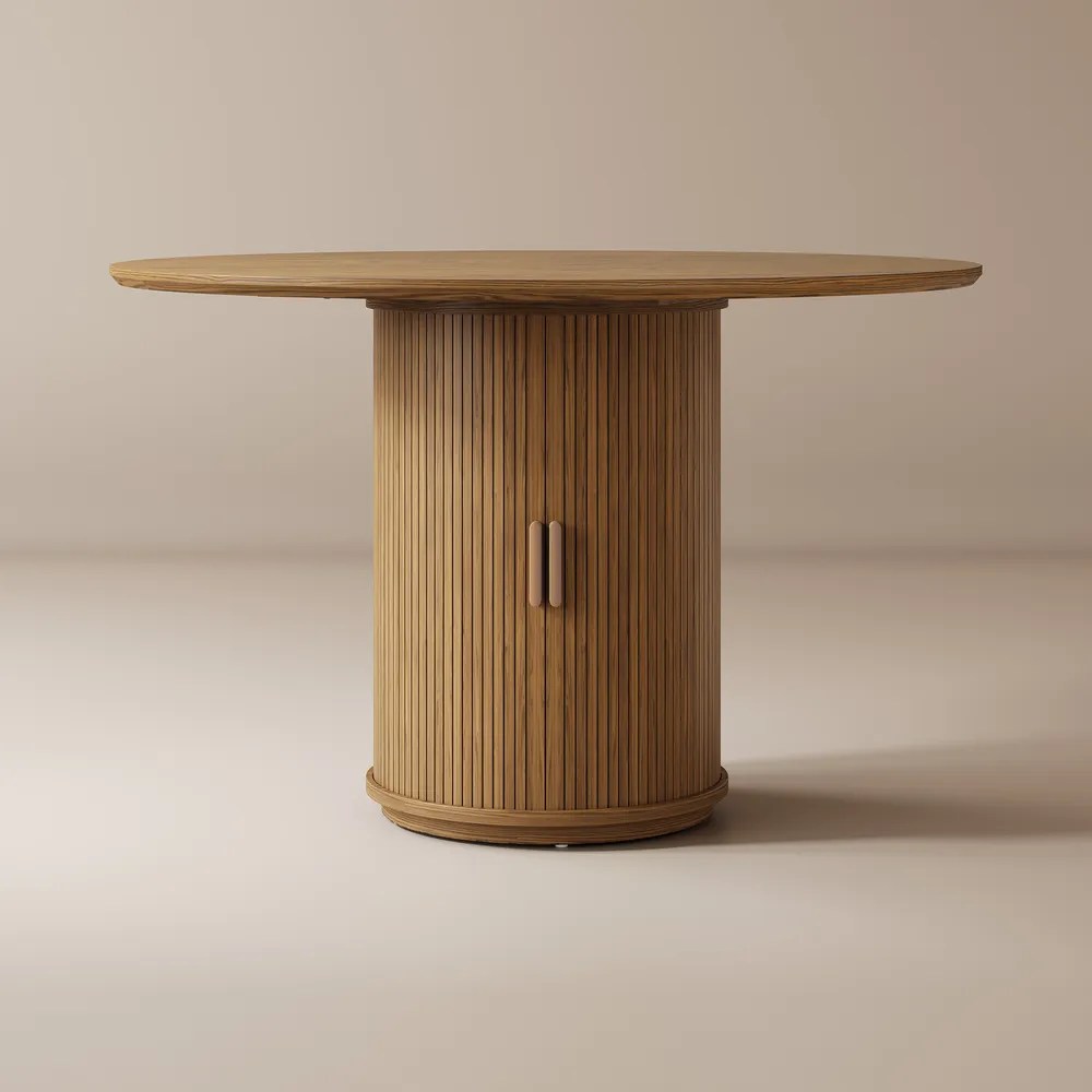 This round dining table is a celebration of timeless craftsmanship and thoughtful design. Its natural ash wood finish brings warmth and sophistication, while the sculptural base adds an artistic touch to any dining space. Integrated storage with sleek tambour doors offers both beauty and function, transforming the table into a sanctuary of refinement.