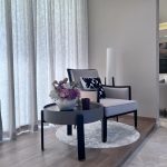 This inviting interior scene features a cozy reading or relaxation corner styled with modern minimalism. A white armchair with a black-and-white cushion sits atop a circular white and grey rug, paired with a round side table featuring black legs and a grey top. The table holds a white vase filled with pink and purple flowers, a candle, and a small decorative object, adding charm and personality. Behind the chair, a tall white cylindrical floor lamp stands beside sheer white curtains that softly diffuse natural light. The light wood flooring is accented by a strip of warm yellow LED lighting along the base, enhancing the tranquil and elegant atmosphere. This setup is ideal for showcasing interior design focused on comfort, simplicity, and refined detail.