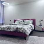This stylish bedroom features a striking magenta bed frame and headboard, dressed in a white and gray patterned comforter with pillows in muted green and gray tones. To the left, a light gray upholstered armchair with a cushion sits near a large window framed by floor-to-ceiling gray curtains. Above the bed, a circular modern ceiling light adds a sleek architectural touch. The flooring combines dark wood with a light-colored area rug, enhancing visual warmth and contrast. A nightstand is partially visible on the right, completing the layout. Ideal for residential interiors or boutique hospitality suites that embrace bold color accents, clean lines, and contemporary comfort.