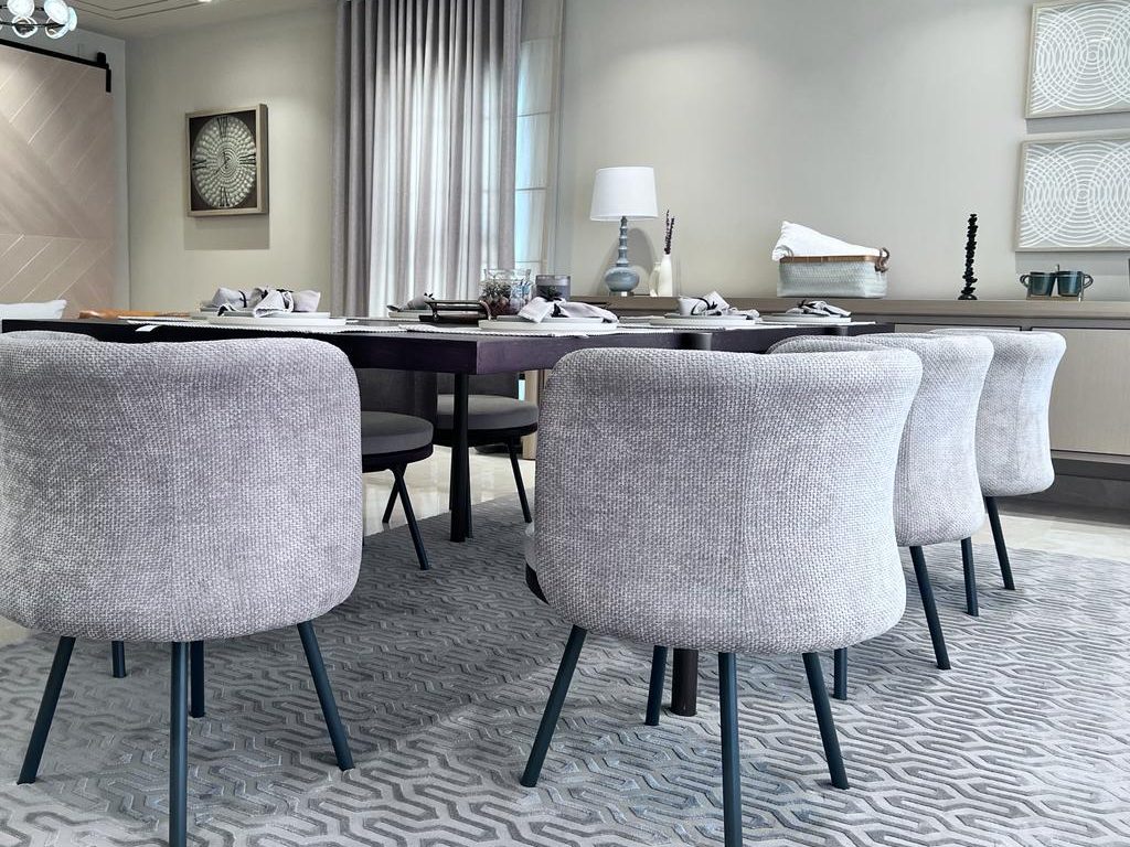 Sunlit contemporary dining area seamlessly connected to a living space. The centerpiece is a sleek matte-black or dark-walnut rectangular dining table (seating 8 comfortably) with clean minimalist lines, elegantly set with textured light-gray linen placemats, stacked white dinner and salad plates, matte-black cutlery, clear glassware, and small bowls—ready for a sophisticated meal. Eight sculptural barrel-style dining chairs in soft light-gray textured fabric with curved wraparound backs and slim black powder-coated legs provide plush, enveloping comfort. Overhead hangs a stunning linear chandelier with clear glass bubble globes in a staggered arrangement, complemented by warm recessed ceiling LEDs and a glowing tray detail. Tall floor-to-ceiling sheer white curtains soften abundant natural light from large windows, while a large geometric-patterned area rug in muted grays anchors the table on high-gloss light marble flooring. In the background, a white sideboard displays a table lamp and minimal decor beneath two large textured white abstract artworks. A cognac leather sofa peeks in from the adjacent living area, creating perfect flow. The overall palette is serene neutrals with warm wood accents—quiet luxury dining at its absolute finest.